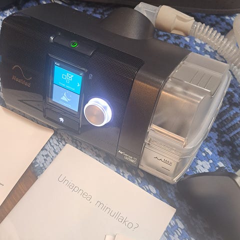 Myydään vuosi sitten ostettu, uudenveroinen automaattisesti säätyvä kaksoispaineventilaattorilaite uniapnean hoitoon. Voidaan käyttää myös CPAP-asetuksilla tai säätää joustavammin kahden eri säädettävän painetason avulla. Laitetta on käytetty vähäisissä määrin ennen uniapneatoimenpidettä, jonka jälkeen se jäi tarpeettomaksi.