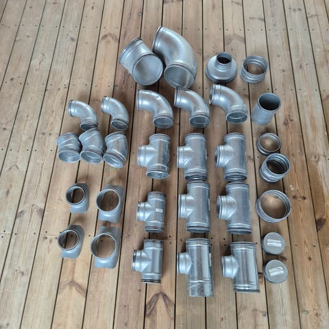Erilaisia ilmanvaihtokanavien osia mm, mutkia. Kuvassa näkyvät kaikki osat. Pääosin 160mm mutta pari mutkaa 200mm ja muutama pienempi osa. Tarkkoja mittoja voin ottaa kysymällä!