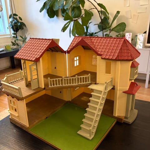 Sylvanian Families talo, jossa on useita huoneita, parveke ja portaat. Kunto on uutta vastaava.