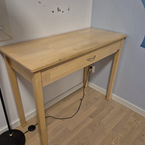 Myydään kuvan mukainen siro työpöytä. Tukeva, mutta käytön jälkiä löytyy. Katso kuvat. Pöydässä kauniit kromin väriset vetimet. Nopeat kaupat!