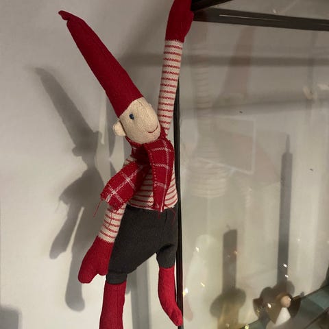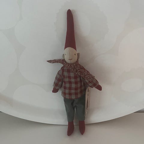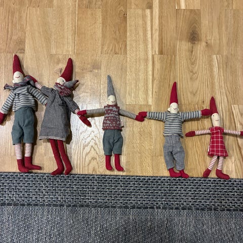 Uudenveroiset S-kokoiset Mailegin tonttutytöt. Raitaiset neulepuserot. Ei leikitty. Pituus noin 30cm.