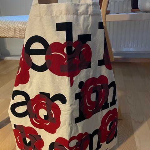 Marikassi on ompelijan ompelema Marimekon 100% ( kuvan väreissä) puuvillakankaasta. Kuosi on Pieni Hyhmä, Aino- Maija Metsolan v 2019. Kassin mitat ovat 33x 35 cm. Sopii vaikka lahjaksi, ei ole ollut käytössä.