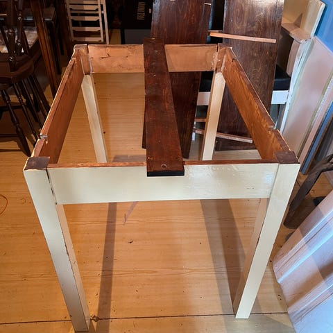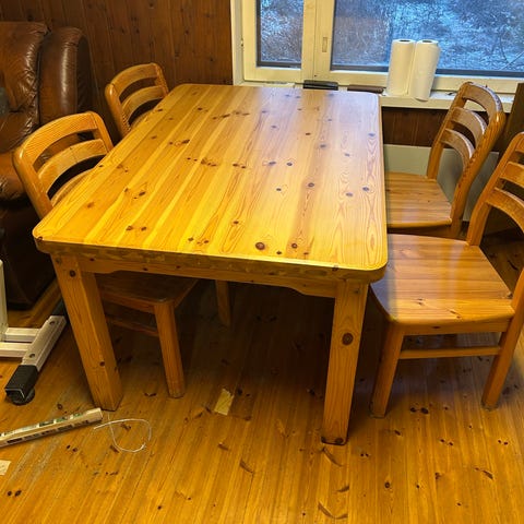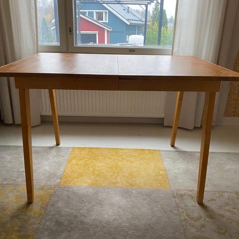 Rakenne kunnossa, pinta vaatii kunnostusta tai pöytäliinan ;-). Rakenne koivua ja mäntyä, pinta mäntyviilu. Peräisin noin 1970-luvulta.