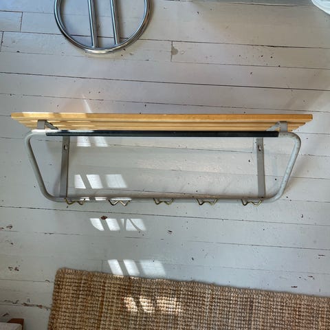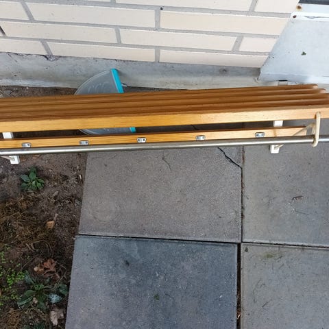 150 cm hyväkuntoinen hattuhylly/ naulakko. Yhdessä kulmassa ollut joku teippi(kuvassa), jossa tarran jämiä, muuten ei ihmeempiä jälkiä osunut silmään. Sijaitsee hepokullassa. Nouto tai 10e lisää niin voin tuoda.