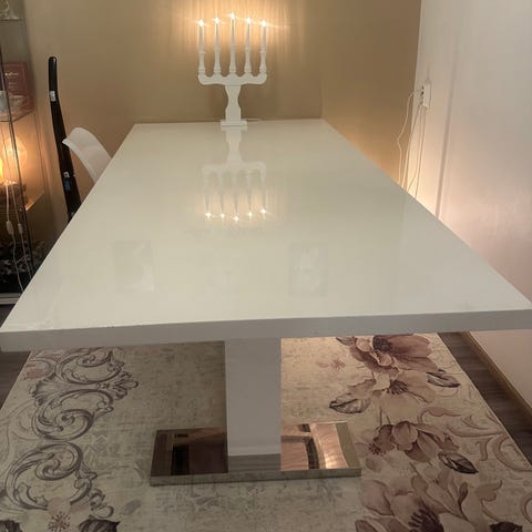 Siisti valkoinen ruokapöytä annetaan tilan puutteen vuoksi.