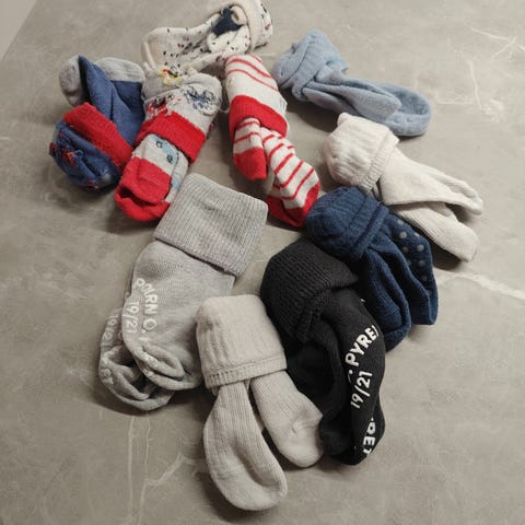 8 paria sukkia ja yhdet jarrupohjalliset ”sukkatossut” koossa 19-22