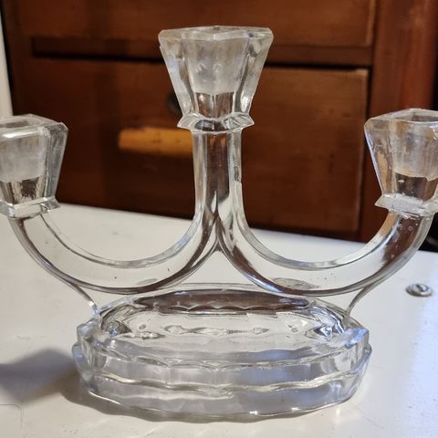Riihimäen lasin kolmihaarainen Art Deco kynttilänjalka. Kirkasta lasia. Korkeus 12 cm, leveys 18,5 cm.