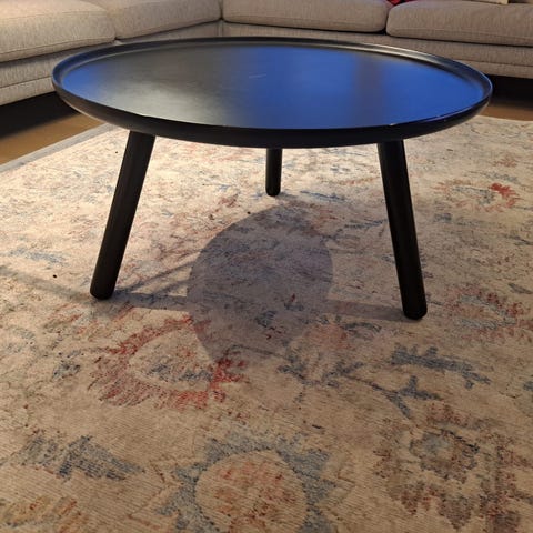 Myydään muuton alta pois Normann Copenhagenin Tablo-sohvapöytä. Halkaisija 78cm, korkeus 42cm. Pöydän pinnassa on jonkin verran kolhuja ja naarmuja joissa valkoisen maalin alta näkyy tummanharmaa pinta. Pöytälevy muovia, jalat saarnia. Hinta uutena Vepsäläisellä 470e.