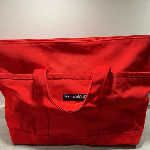 Marimekko kangaslaukku naisille, valmistettu 100 % puuvillasta. Laukku on punainen ja siinä on kukkakuviointi. Sisävuori on 100 % polyamidia.