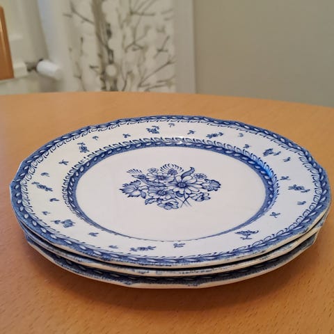 Arabia Suomenkukka lautaset, joissa sinivalkoinen kukkakuvio. Setissä on neljä lautasta. Yhdessä lautasessa näkyvämpi jälki. Tämä lautanen näkyy kuvissa viimeisenä.