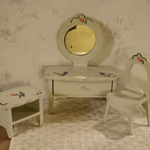 Samaa sarjaa " Aristocratic Furniture " on saatavana myös ruokapöytä sekä neljä samanlaista tuolia. Pöytä on hyväkuntoinen, tuoleissa kulumaa. Kuvia pyydettäessä. Ne saa samaan pakettiin hintaan + 8€.
