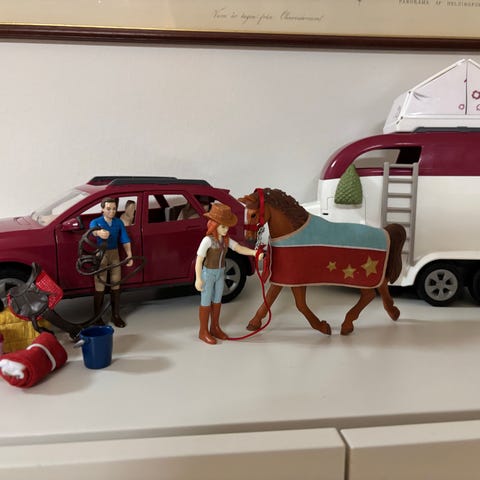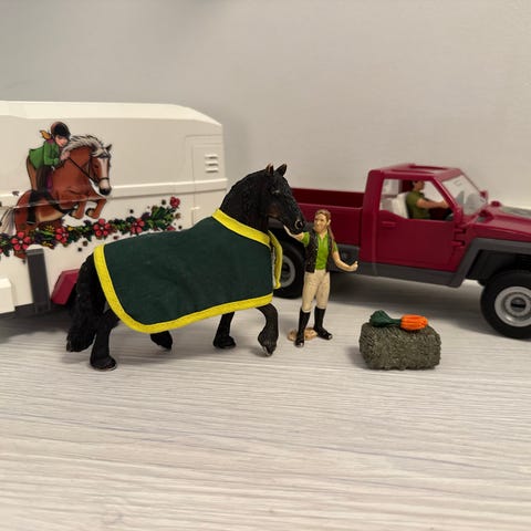 Hyväkuntoinen auto ja hevoskuljetuskärry sekä kuljettaja.