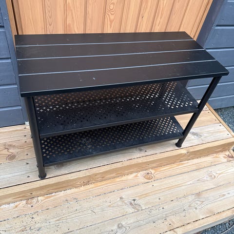 Tyylikäs tammi/metallirunkoinen kenkäteline kahdella tasolla. Toisessa reunassa metallissa lommo (näkyy kuvassa).