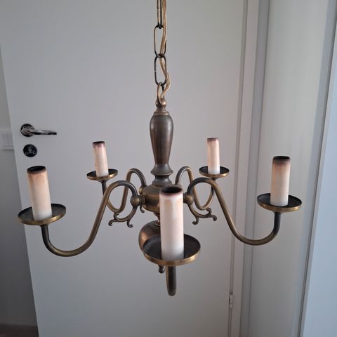 Messinkinen kattovalaisin, jossa viisi lamppua ja valkoiset varjostimet. Valaisin kiinnittyy kattoon ketjulla ja metallisella kiinnityskupilla. Pistokekytkentä.