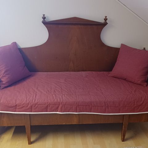 Tummanvihreä 90-luvun vuodesohva, iloisella istuinkankaalla (oma laittama). Mielestäni kankaan saa pois/vaihdettua, pitää vielä tutkia tarkemmin.