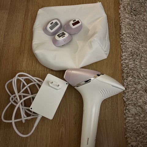 Philips Lumea IPL-valolaite ihokarvojen poistoon. Väri vaaleanpunainen ja valkoinen. Sisältää vaihdettavan hoitoalueen.
