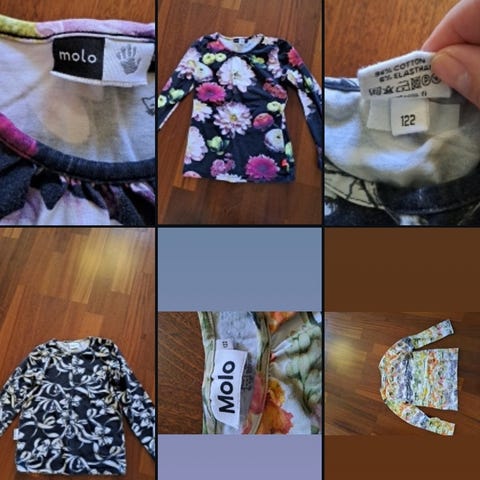 Myydään Molon kerrastopaita (merinovilla, kukkakuosi), Vimman pinkki paita (pikkutahroja), Peppi-paita (en huomaan vikoja) ja Papun paita, jossa voikukkatahraa (maastotuu kuosiin melko hyvin) yhteensä 12€