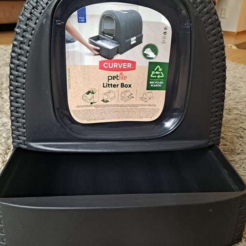 Trixie Litter Box kissanhiekka-astia, jossa on harmaa alaosa ja valkoinen kansi. Astia on varustettu läpikuultavalla ovella, joka helpottaa kissan pääsyä ja sisältää ilmanvaihtoaukkoja. Soveltuu kissojen hiekkalaatikoksi. Sisälle laitetaan kissanhiekkaa (meillä on sitä kissanhiekkaa myös myynnissä 5€) ja sitten kissa käy siellä wc: llä.