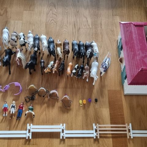 Myydään Schleich hevosleikkisetti. Sisältää erilaisia hevosia, ratsastajia, tallirakennuksen, pesupaikan sekä erilaisia loimia/syötävää/suitsia/satuloita. Tarrat ovat hyvässä kunnossa, ei piirretty, ei repsota.