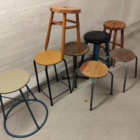 Vanhemmat Merivaaran pyörivät jakkarat tai työtuolit. Istuinoasan halkaisija 38 cm ja säädettävä korkeus 45- n. 70 cm. Tummansininen keinonahka verhoilu. Nouto Hgin Vallilasta. Hinta siis 40 €/ kpl.