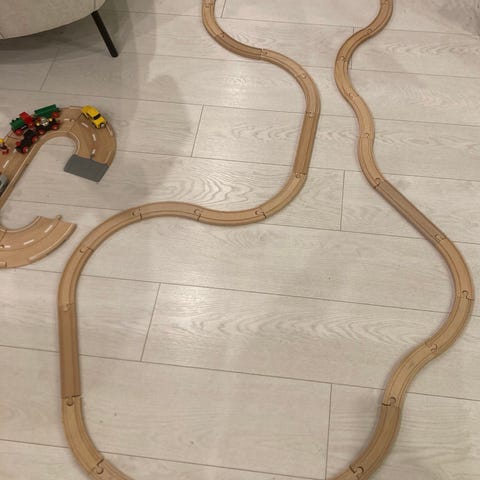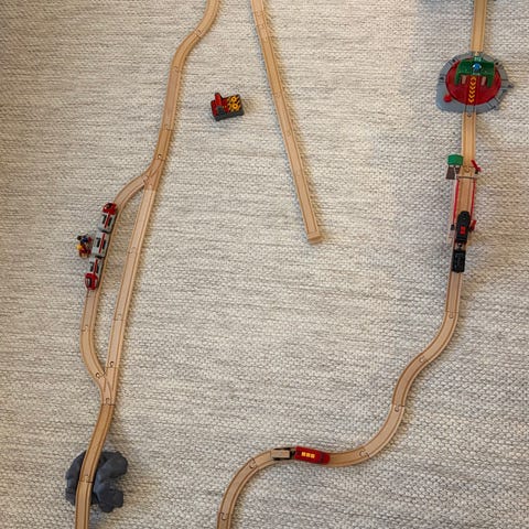 BRIO puinen junarata sisältää erilaisia kaarevia ja suoria rataosia. Mukana on useita puisia junavaunuja ja vetureita eri väreissä yht. 10 kpl. Lisäksi lisäosia kuten puinen asema, seepra ja puita, lisäksi magneetilla apinapuu, joka kiinnittyy junaan ajaessa sen alta.