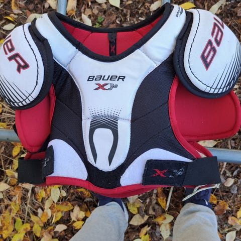 Bauer Jr 8/10 jääkiekkosuojus, väriltään musta ja punainen. Suojus on suunniteltu juniorikokoisille pelaajille ja tarjoaa suojaa jääkiekon harjoitteluun ja peleihin.