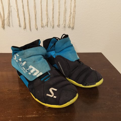 Otsikon mukaiset Salmingin siistit, vähän käytetyt sisäpelikengät Punaiset 39 ja siniset 40.Hinta 15e pari.