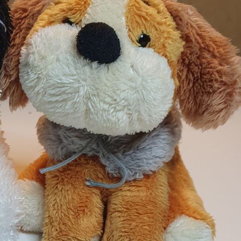 Pehmonallet ja -pupu. Rusettikaulaisen pehmonallen korkeus 7 cm. Sen toisesta korvasta on leikattu pala.