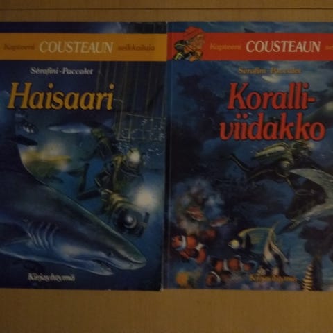 Kapteeni Costeaun seikkailuja -sarjakuvakirjat 2 kpl sisältäen teokset Koralliviidakko ja Haisaari. Pehmeäkantiset kirjat käsittelevät merellisiä seikkailuja ja tutkimuksia. Haisaaressa 2 sivua irronnut keskiniteestä. Yhteishintaan 8 e.