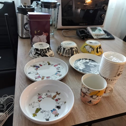 Muumi Arabia astiastosetti, joka sisältää kulhon ja mukin. Oranssi pohja ja hattivatti kuviointi. Vain nouto, ei lähetystä.