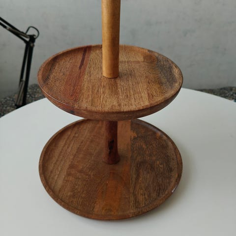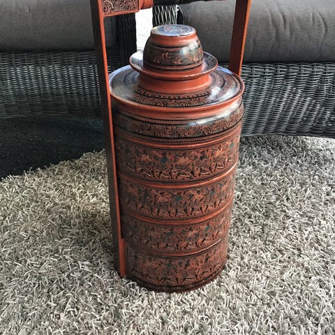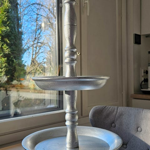 Tuollainen metallinen kerrosvatisysteemi. Kokonaiskorkeus 47 cm. Kullansävyinen patina. Painavahko.