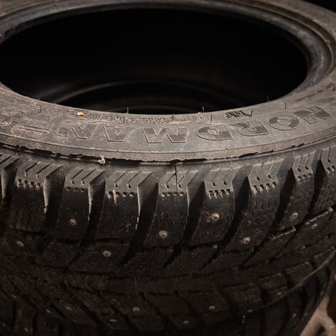 Ylimääräiseksi jääneet Nokian Nordman 7 renkaat, Paistoleima 3120 purettu vanteilta tänään 14.12.25 renkaat pitävät vielä hyvin. vaihdon syy että auto menossa kulmiin ja sitä varten hommattu uudet renkaat koska näissä on laidat kuluneet kulmien takia hieman. Yhdessä renkaassa enemmän kulumaa, Pintaa vielä renkaissa 5-7mm ja vain yhdestä renkaasta näytti yksi nastapuuttuvan. Renkaat vielä pehmeät ja ei ole nokialaisen tapaan vielä reunatkaan lähtenyt halkeilemaan.