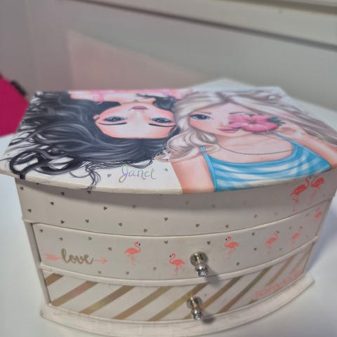 Top Model korurasia, jossa peili, valot ja useita lokeroita korujen säilytykseen. Rasia on väriltään pinkki ja siinä on koristeluja. Sopii pienten korujen järjestämiseen.