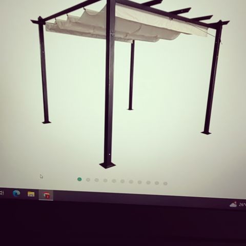 Myydään hyväkuntoinen pergola, joka ollut käytössä vain yhden kesän. Mustat metallijalat ja luonnonvaalea/ beige suojakangas, jonka saa vedettyä sivuun molemmista päistä. Koko 2,9mx2,9m.