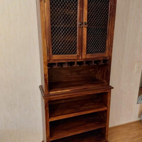 Erittäin hyväkuntoinen acaziapuinen kaappi / vitriini. L80xK178xS40cm. Nouto Akaan Toijalasta. Painava, joten omat kantajat mukaan.
