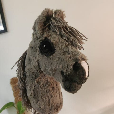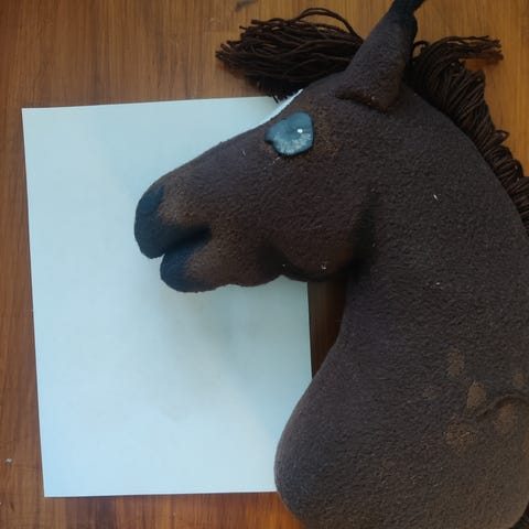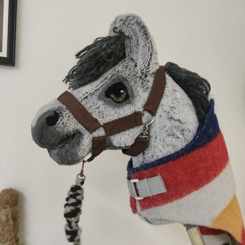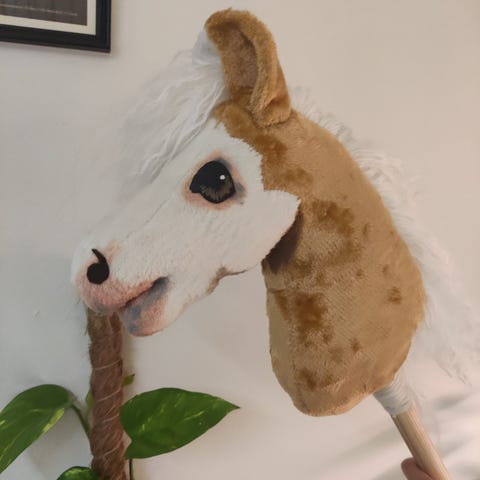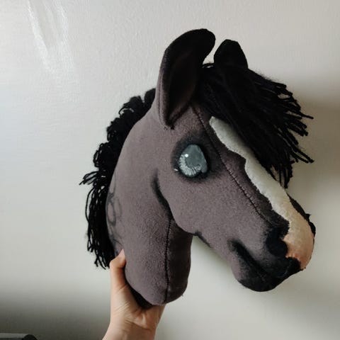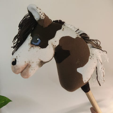 Käsityönä fleecestä valmistettu ruskea keppihevonen.