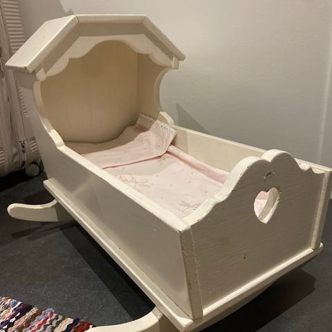 Myydään meille tarpeettomaksi jäänyt Nätti punainen puinen nuken kehto, molemmilla puolilla kehdossa kaunis kukkakuvio. Kehdon pituus 50 cm ja leveys 30 cm. Nuken pituus 40 cm, nuken hiuksia voi kammata ja tehdä kivoja kampauksia.