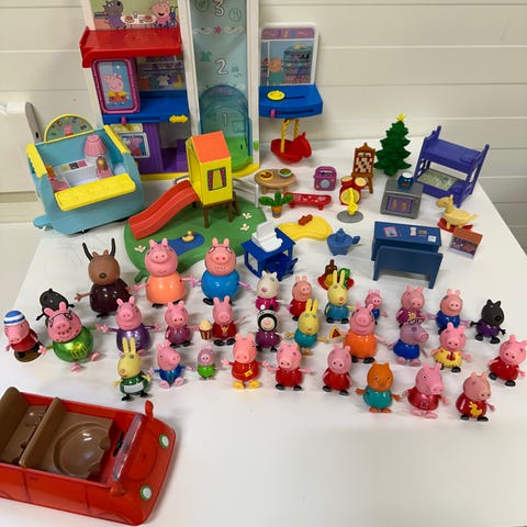 Peppa Pig hahmofiguurit leikkisetti sisältää useita hahmoja ja leikkivälineitä. Setti sopii lasten leikkeihin ja sisältää erilaisia hahmoja, kuten possuja ja muita eläinaiheisia figuureja. Autossa ja kissassa jälkiä hieman. Katso kuvia