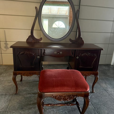 Vanha peilipöytä myydään tilanpuutteessa. Pöytätason pinnassa kulumajälkiä. Muuten ehjä ja hyväkuntoinen. Laatikko ja kaksi kaappia +avain kaappiin. Pituus 115 cm, korkeus 215 cm syvyys 50 cm. Vain nouto
