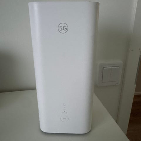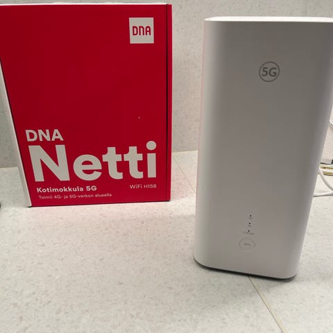 DNA kotimokkula 5g Reititin valkoinen. Langaton verkkolaite, joka mahdollistaa internet-yhteyden jakamisen useille laitteille. Sisältää virtajohdon ja LED-merkkivalot laitteen tilan näyttämiseksi.