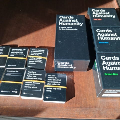 Cards Against Humanity korttipeli, sisältää useita kortteja mustassa laatikossa. Peli on suunniteltu aikuisille ja tarjoaa viihdyttävän tavan pelata ryhmässä.