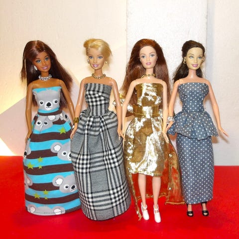 -Kohteeseen kuuluvat kuvan vaatteet: kaikki sopivat parhaiten tavallisen kokoiselle nykyajan Barbie-nukelle. Jotkut vaatteista on helpompi pukea nimenomaan sellaisille nukeille, joiden jalat ovat kovaa muovia.