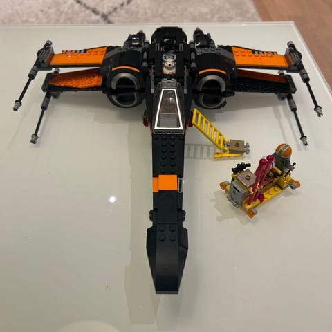 LEGO Star Wars Poe’s X-Wing Starfighter -alus, mallinumero 75102. Sisältää kaikki legofiguurit ja lisäosat. Kaikki muut osat pitäisi olla tallessa, vain viimeisessä kuvassa näkyvä toinen punainen ohjus puuttuu.