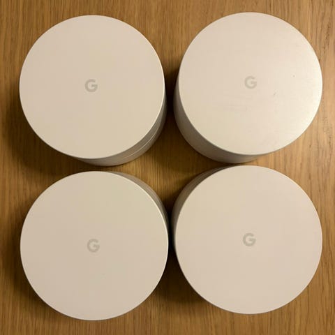 2kpl Google Wifi langatonta tukiasemaa. Toimivat moitteettomasti. Virtalähteet on US mallia, mutta toimivat hyvin mukana tulevien schuko-adaptereiden avulla.