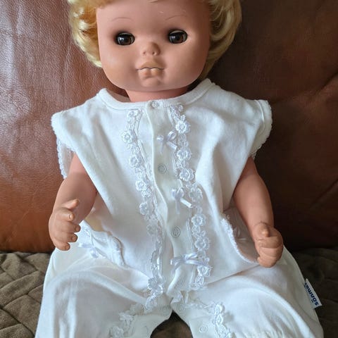 Vanha nukke lapinpojan asu yllään . Matkamuisto 60-luvulta . Sulkee silmänsä . Vaatteet vähän kärsineet . Yvi, Soppeenmäestä.