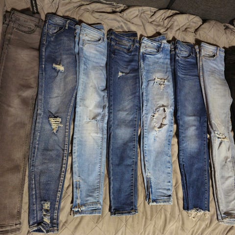 Myydään naisten farkkusetti. Osaa pidetty enemmän, osaa vähemmän.