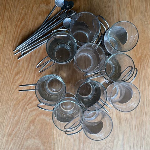 Neljä glögilasia / muuta lämmintä juomaa varten. Metalliosan saa pesua varten irti. Ehjät, käytetty vain kerran tai kaksi.