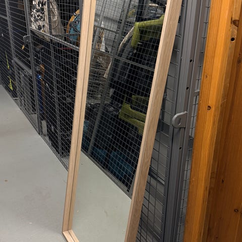 IKEA peili, jossa puurunko. Täysipitkä peili seisoo tukevasti omilla jaloillaan ja sopii esimerkiksi makuuhuoneeseen tai eteiseen.