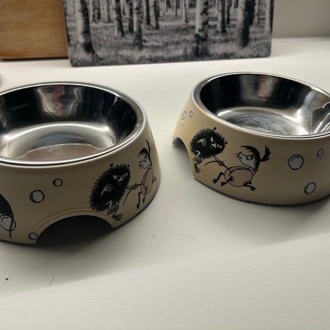 Ruoka kuppi halk 14cm, vesi kuppi halk. 17,5 cm, peltipurkki halk. 16cm kork. 18cm silikoni alusta koko 30x48 Hauska setti pienelle koiralle 45 eur.