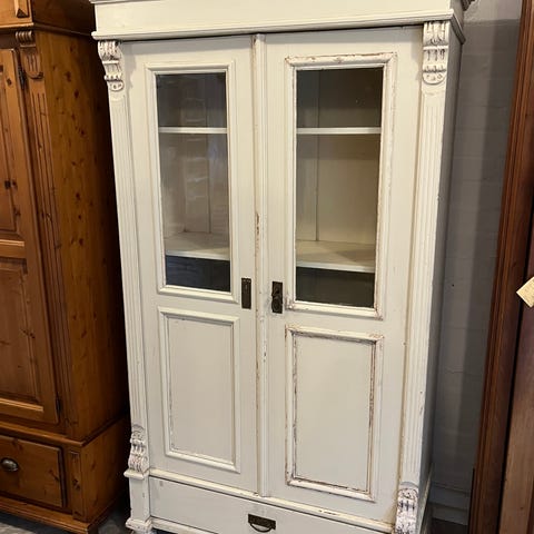 Ruotsista antiikkiliikkeestä ostettu ja Suomeen tuotu. Laadukas ja painava, joten vaatii voimakkaat kantajat. Vuosikymmenten aikana on syntynyt ajanpatinaa ja selkeitä käytön jälkiä näkyvissä, katso kuvat. Mutta kaappi on käytettävyydeltään ja ikäisekseen hyvä, mutta kunto kohtalainen, katso kuvat.